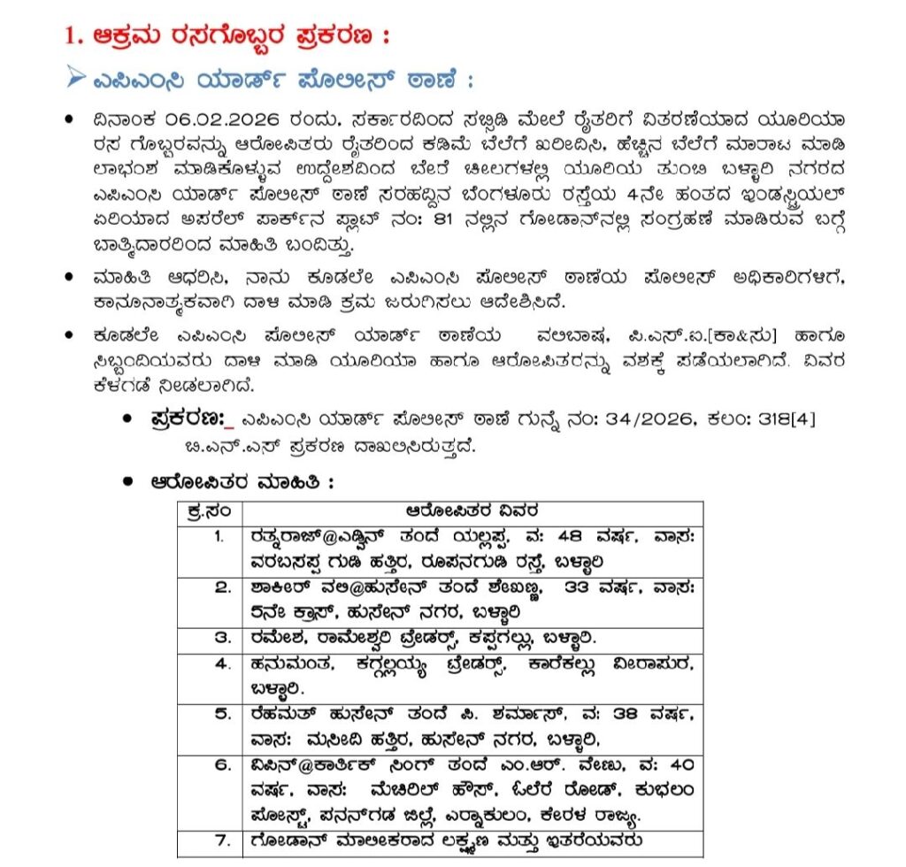 ಬಳ್ಳಾರಿ ನಗರದ ಬೆಂಗಳೂರು ರಸ್ತೆಯ ಕೈಗಾರಿಕಾ ಪ್ರದೇಶದ, ಹಂತ 4, ಅಪ್ಯಾರಲ್ ಪಾರ್ಕ್, ಪ್ಲಾಟ್ ಸಂಖ್ಯೆ 81 ರಲ್ಲಿರುವ ಗೋಡೌನ್ನಲ್ಲಿ ಸಂಗ್ರಹಿಸಿದ್ದ ಅಂದಾಜು ಹತ್ತು ಲಕ್ಷ ಮೌಲ್ಯದ ಯೂರಿಯಾ ಗೊಬ್ಬರವನ್ನ ವಶಕ್ಕೆಪಡೆದ ಅಧಿಕಾರಿಗಳು ತನಿಖೆ ಮುಂದುವರೆಸಿದ್ದಾರೆ.