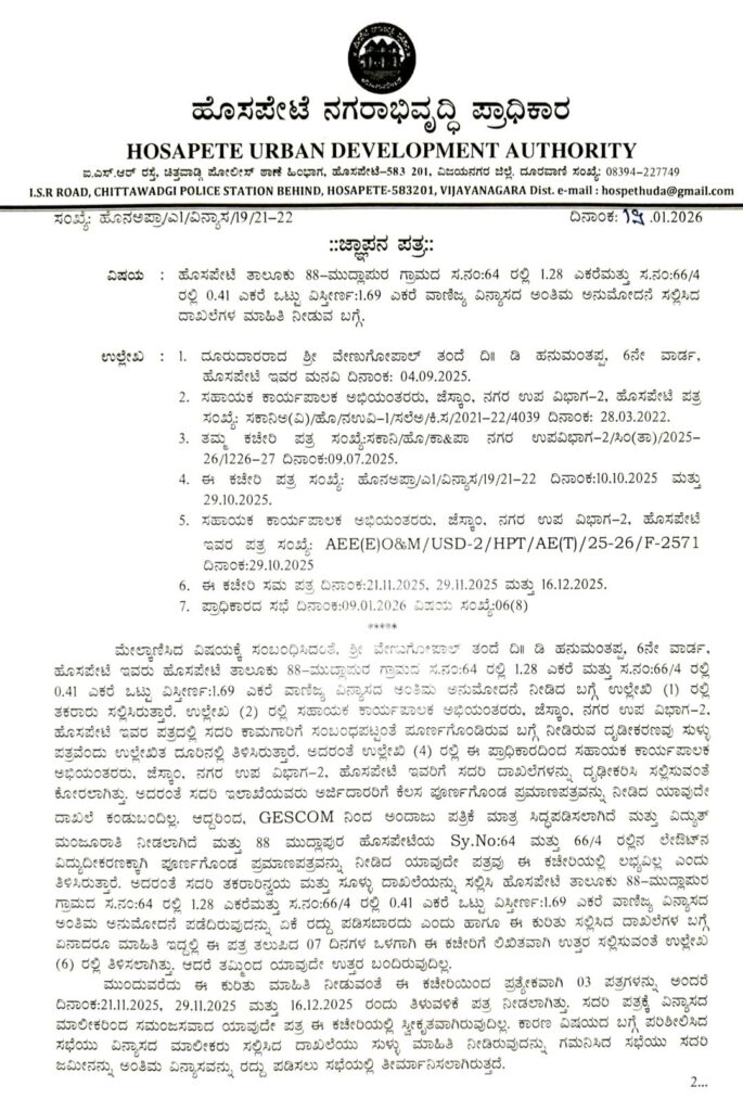 ಹೊಸಪೇಟೆ (ವಿಜಯನಗರ ) ಒಳಚರಂಡಿ, ರಸ್ತೆ ಮತ್ತು ವಿದ್ಯುತ್ ಕಾಮಗಾರಿಯ ನಕಲಿ ದಾಖಲೆ ಸಲ್ಲಿಕೆ: ಭಟ್ರಳ್ಳಿ ಬಿಜೆಪಿ ಕಚೇರಿ ಹತ್ತಿರದ ವಾಣಿಜ್ಯ ವಿನ್ಯಾಸದ (Layout) ಅನುಮೋದನೆ ರದ್ದುಗೊಳಿಸಿದ ಹುಡಾ. ಹೊಸಪೇಟೆ: ತಾಲೂಕಿನ ಮುದ್ಲಾಪುರ ಗ್ರಾಮದ ಸರ್ವೆ ನಂಬರ್ 64 ಮತ್ತು 66/4 ರಲ್ಲಿ (ಭಟ್ರಳ್ಳಿ ಹತ್ತಿರದ ಬಿಜೆಪಿ ಕಚೇರಿ ವ್ಯಾಪ್ತಿಯಲ್ಲಿ) ನಿರ್ಮಿಸಲು ಉದ್ದೇಶಿಸಿದ್ದ ವಾಣಿಜ್ಯ ವಿನ್ಯಾಸಕ್ಕೆ ನೀಡಲಾಗಿದ್ದ ಅಂತಿಮ ಅನುಮೋದನೆಯನ್ನು ಹೊಸಪೇಟೆ ನಗರಾಭಿವೃದ್ಧಿ ಪ್ರಾಧಿಕಾರವು (HUDA) ತಕ್ಷಣದಿಂದ ಜಾರಿಗೆ ಬರುವಂತೆ ರದ್ದುಗೊಳಿಸಿ ಆದೇಶ ಹೊರಡಿಸಿದೆ.