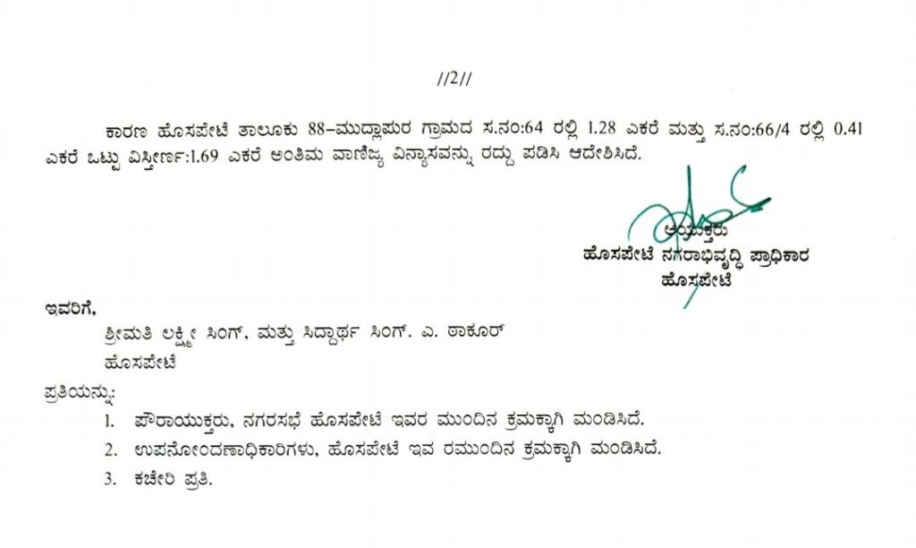 ಒಳಚರಂಡಿ, ನೀರು, ರಸ್ತೆ ಮತ್ತು ವಿದ್ಯುತ್ ಸಂಪರ್ಕದಂತಹ ಮೂಲಭೂತ ಸೌಕರ್ಯಗಳ ಬಗ್ಗೆ ನಕಲಿ ದಾಖಲೆಗಳನ್ನು ನೀಡಿ ವಾಣಿಜ್ಯ ವಿನ್ಯಾಸದ ಅಂತಿಮ ಅನುಮೋದನೆ ಪಡೆದಿರುವುದು ಸಾಬೀತಾದ ಹಿನ್ನೆಲೆಯಲ್ಲಿ, ದಿನಾಂಕ 09.01.2026 ರಂದು ನಡೆದ ಪ್ರಾಧಿಕಾರದ ಸಭೆಯ ತೀರ್ಮಾನದಂತೆ, ಸದರಿ 1.69 ಎಕರೆ ಜಮೀನಿನ ವಿನ್ಯಾಸದ ಅನುಮೋದನೆಯನ್ನು ರದ್ದುಪಡಿಸಲಾಗಿದೆ. ಮುಂದಿನ ಕ್ರಮಕ್ಕಾಗಿ ಆದೇಶದ ಪ್ರತಿಯನ್ನು ನಗರಸಭೆ ಪೌರಾಯುಕ್ತರು ಹಾಗೂ ಉಪನೋಂದಣಾಧಿಕಾರಿಗಳಿಗೆ (Sub-Registrar) ರವಾನಿಸಲಾಗಿದೆ ಎಂದು ಹೊಸಪೇಟೆ ನಗರಾಭಿವೃದ್ಧಿ ಪ್ರಾಧಿಕಾರ ತಿಳಿಸಿದೆ.